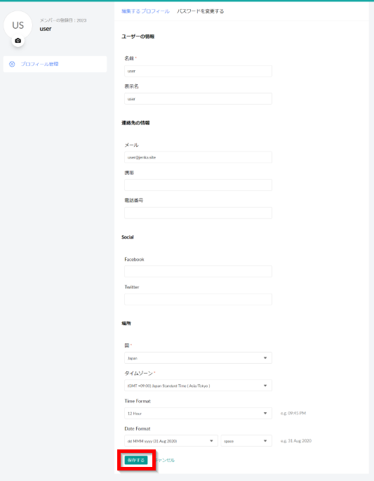 登録すると以下のページに遷移して、環境設定などを行います。特に変更がなければ、一番下の保存するをクリックして、設定は完了です。