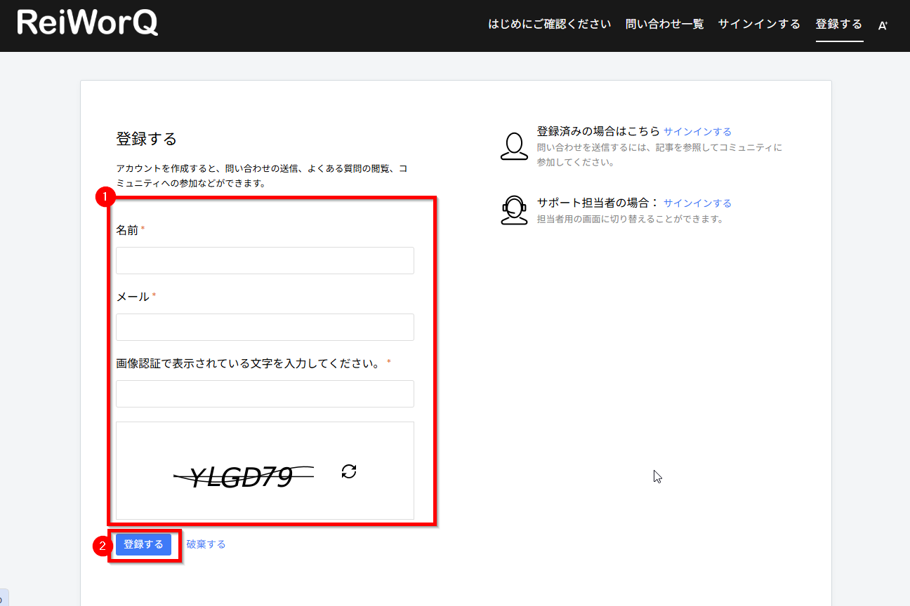 - お名前とメールアドレスを記載してください。画像認証の文字列を入れたら登録をクリックします。